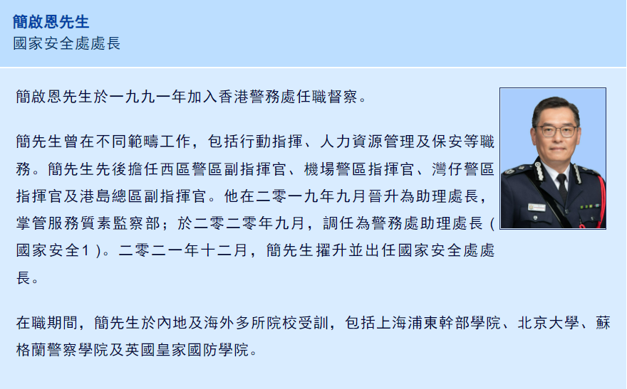 簡啟恩先生 國家安全處處長 簡啟恩先生於一九九一年加入香港警務處任職督察 簡先生曾在不同範疇工作包括行動指揮人力資源管理及保安等職務 簡先生先後擔任西區警區副指揮官機場警區指揮官灣仔警區指揮官及港島總區副指揮官 他在二零一九年九月晉升為助理處長掌管服務質素監察部於二零二零年九月調任為警務處助理處長 國家安全1 二零二一年十二. 據資料簡啟恩於1991年加入警隊任職督察主力行動指揮人力資源管理及保安等先後擔任西區警區副指揮官機場警區指揮官灣仔警區指揮官及港島總區副指揮官 簡啟恩曾赴內地及海外受訓包括上海浦東幹部學院北京大學蘇格蘭警察學院及英國皇家國防學院 他於2019年9月晉升為助理處長掌管服務質素監察部 晉升一年後現調入國安處 警隊國安.